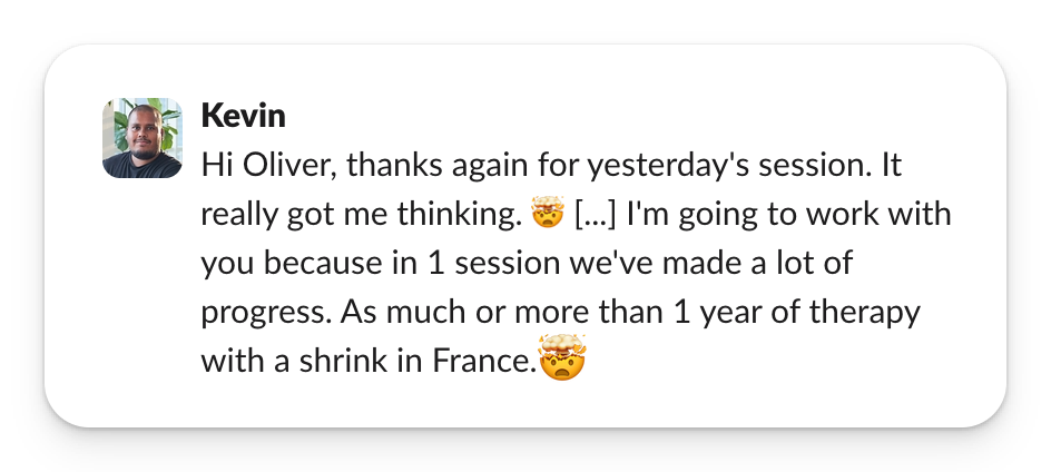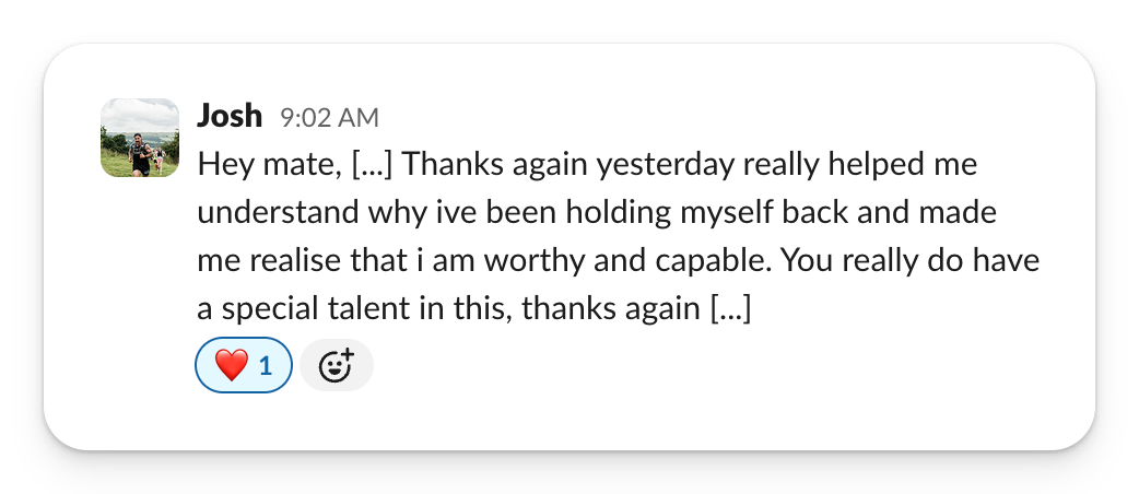 • The coaching includes on-demand weekly hour-long conversations (up to 90 min if needed).